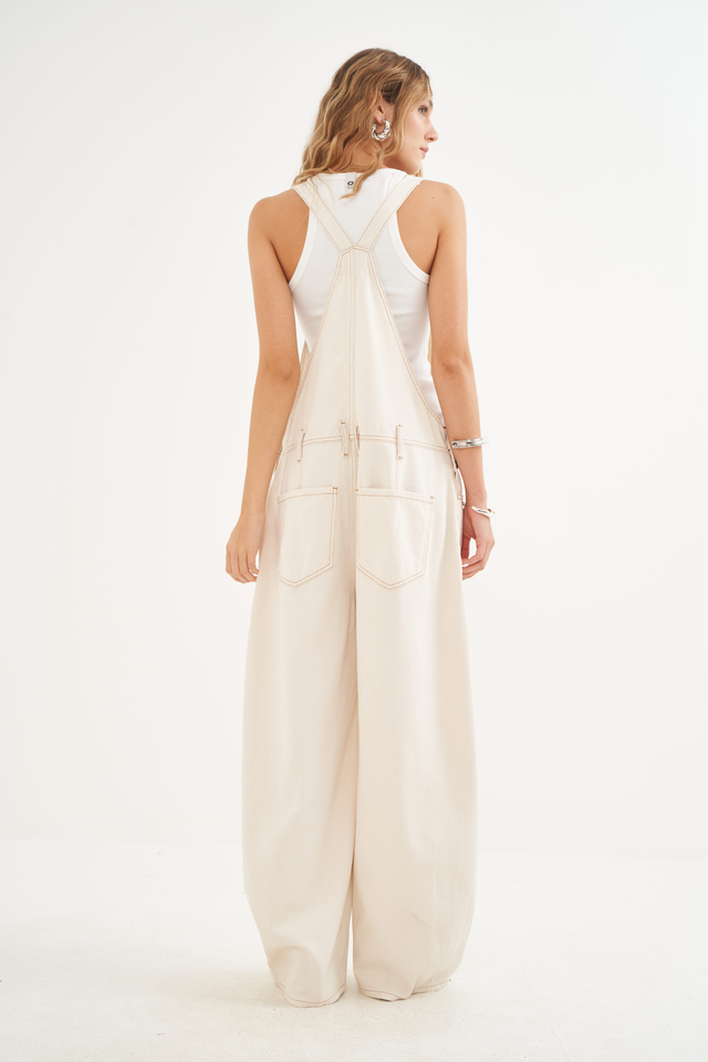 Jardineira: Modelagem pantalona ampla, com alças reguláveis, bolso frontal no peitilho e fechamento lateral por botões.