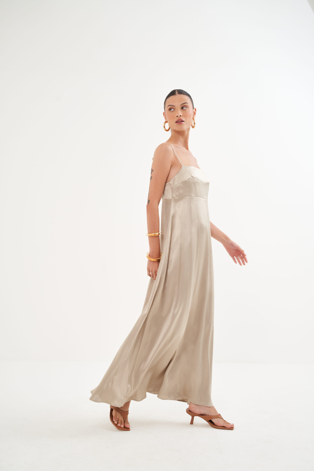 Peça/Look: Vestido Longo Acetinado – RIVIERA